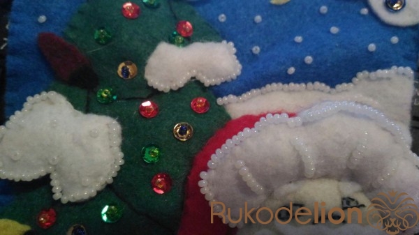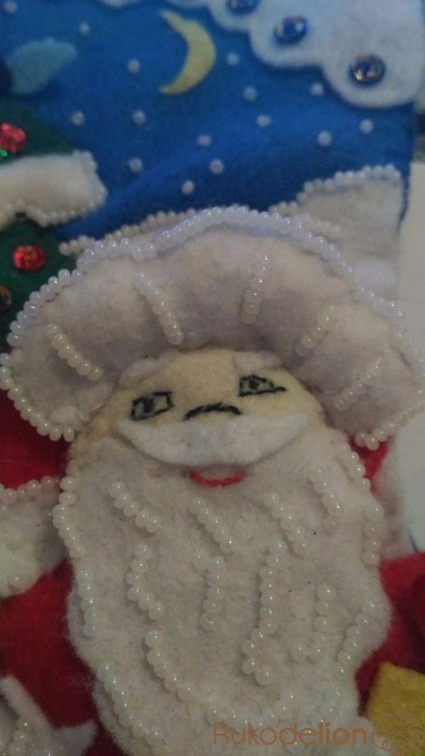 Пришиваем белый бисер по  контору и хаотично по центру к снежным веткам и к меху на шубе Деда Мороза. Мех на шапке украшаем белым бисером по контуру и вертикальными полосками. Бороду украшаем по контуру и по центру изогнутыми линиями.
