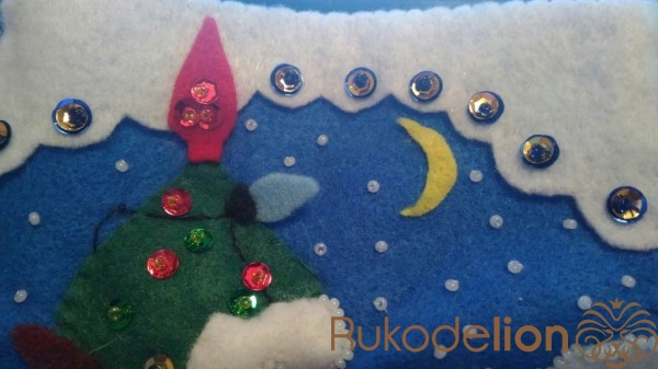 Пришиваем в разнобой на синем фоне белый бисер имитируя звезды.  На белом фоне волнистыми линиями имитируем сугробы. Пришиваем месяц  из желтого фетра.