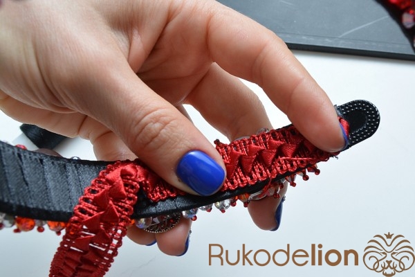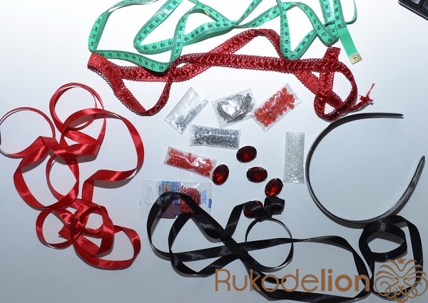 1. лента атласная черного или красного цвета, шириной 1см, декорированная полоска красного цвета.