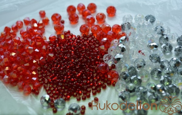 4. бусинки красного и прозрачного цвета, размера 4х6 мм,