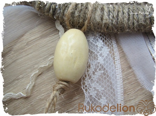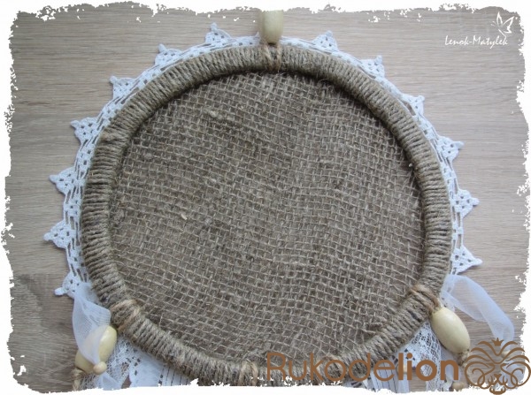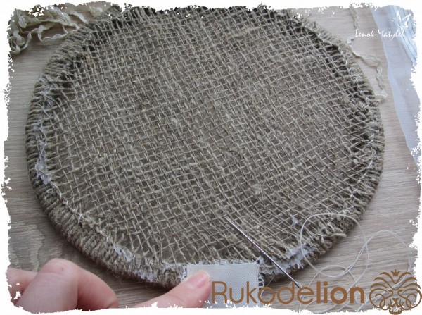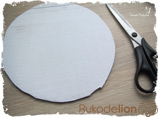 На куске картона рисуем круг диаметром 20 см (обвела то, что было под рукой :) ), вырезаем. Далее внутри рисуем еще один круг, поменьше (диаметром 18 см). При помощи канцелярского ножа вырезаем и его. Получился вот такой «бублик», который декорируем бечевкой при помощи клея-пистолета.