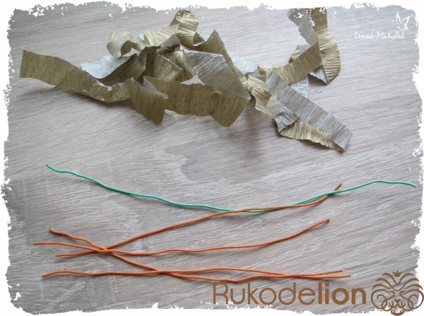 Рисуем, вырезаем. Нарезаем нужной длины проволоку. Обклеиваем ее гофрированной бумагой при помощи клея ПВА. Получившиеся палочки приклеиваем к "перышкам".