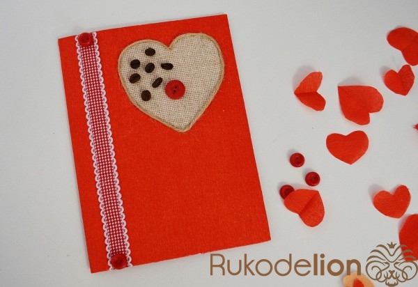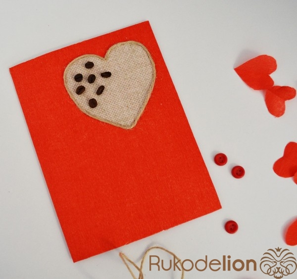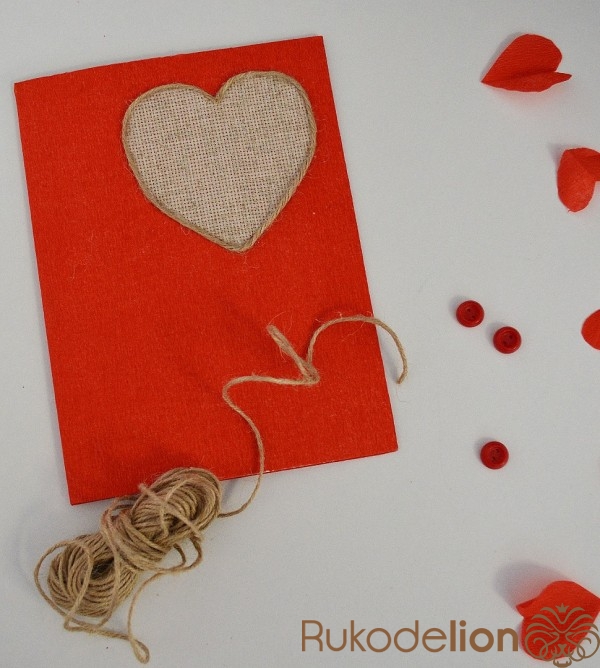 Вырезаем из мешковины сердечко и так же на бумажный клей  садим его в правый верхний угол открытки.