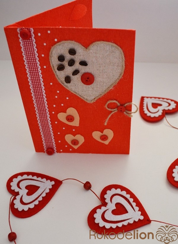 Берем зерна кофе и приклеиваем их в уголочек сердечка, туда же садим и красную пуговицу.