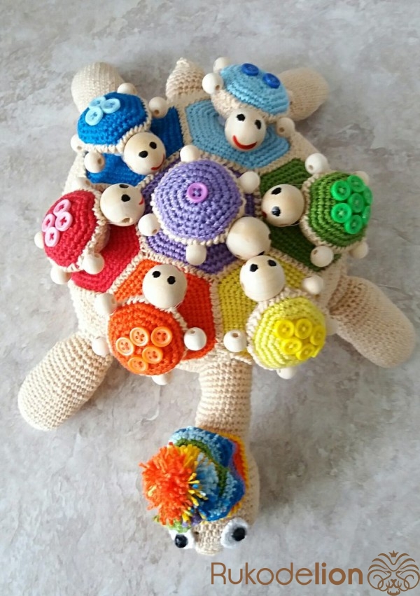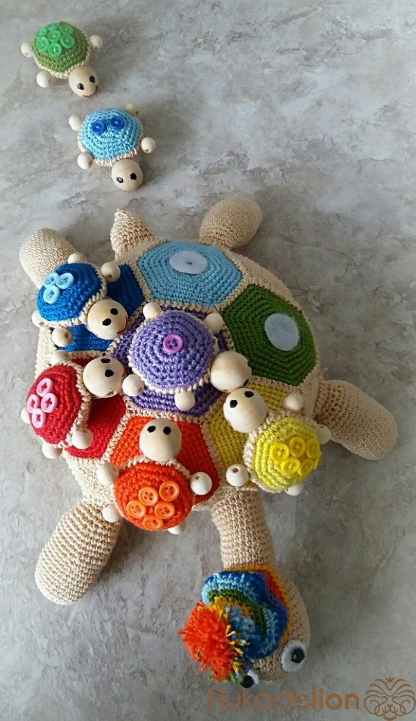 Каждый черепашонок крепится к папе на липучку.При помощи этой игрушки Вы можете изучать с малышом цвета радуги,а также счет до семи,так как на каждой маленькой черепашке есть пуговки количеством от одного до семи.