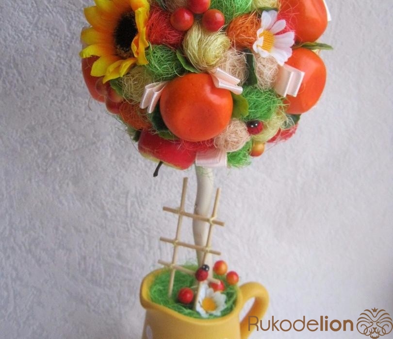 Прекрасно будет смотреться на любой кухне. Подойдет в качестве подарка для женщины, ценящей домашний уют. Фруктовый топиарий - подарок на день рождения, новоселье, а так же на любой случай.