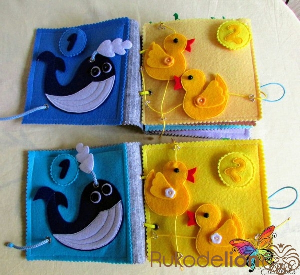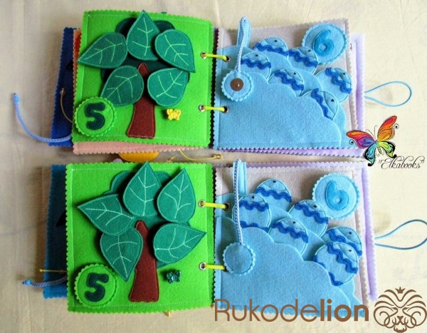 ? Третий разворот - изучаем цифры 5 и 6. Листья на дереве на пришивных кнопках. В головки рыбок надежно вшиты неодимовые магниты. Рыбок можно вылавливать с помощью удочки.