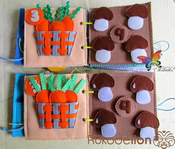 ? Второй разворот - изучаем цифры 3 и 4. Морковки можно положить в корзинку, сами морковки состоят из разных наполнителей (для тактильных ощущений): синтепон, бусинки, шуршащий пакет.