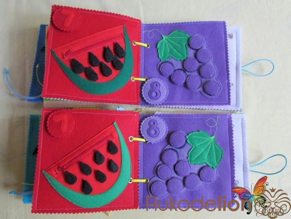 ? Четвертый разворот - изучаем цифры 7 и 8. Косточки у арбуза на пришивных кнопках, косточки можно положить в кармашек арбуза (на молнии). Виноградинки на липучках.