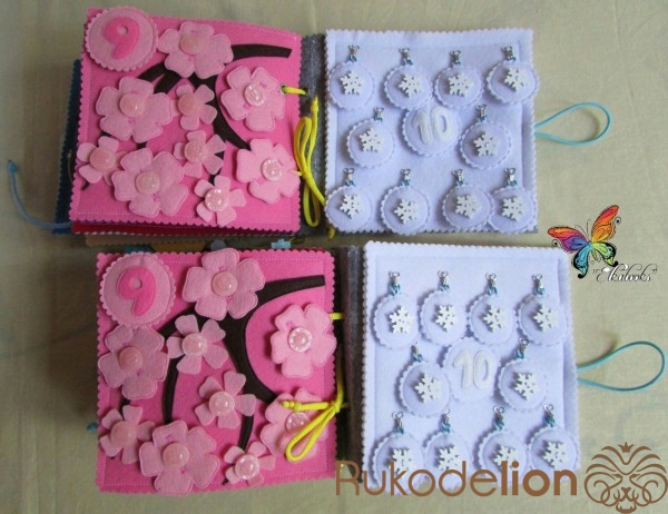 ? Пятый разворот - изучаем цифры 9 и 10. У сакуры 5 съемных цветков на пуговицах. Снежинки крепятся на крючки.