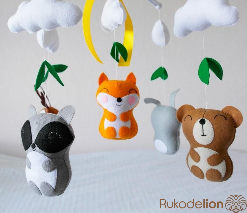 Авторский мобиль "Лесные друзья" увлчет малыша в первые месяцы жизни, а в будущем целый игровой набор лесных жителей.