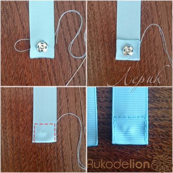 Пришиваем одну часть кнопки на конец ленты. Если у Вас не однотонная лента, как в моем случае, пришивать кнопку нужно на лицевую сторону (сторону с рисунком).