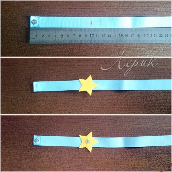 На ленте откладываем 10 см, чтобы определить, куда пришить звездочку. Складываем две детали звезды, вложив между ними ленту. Сшиваем швом «вперед иголкой» или обметочным. Обратите внимание, обе части кнопки должны оказаться на одной стороне ленты.