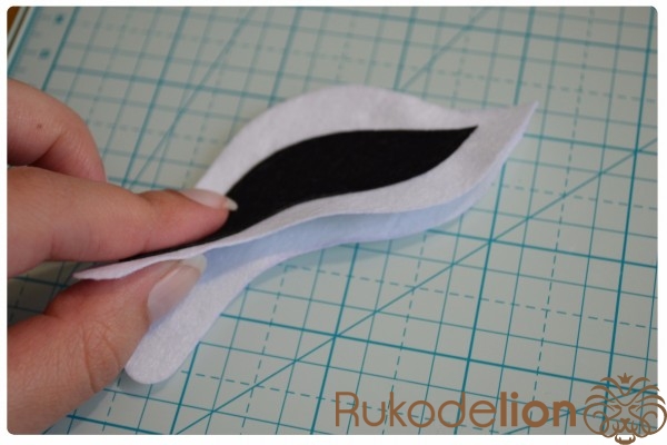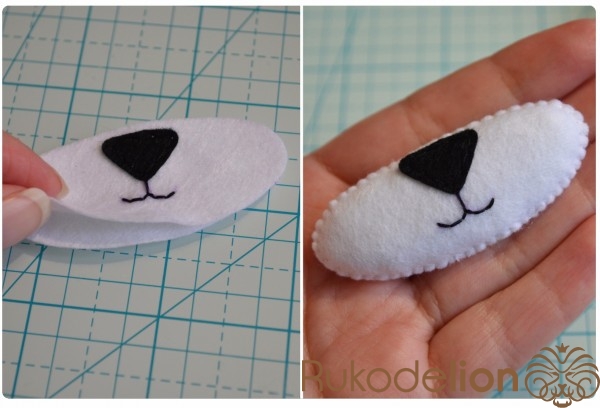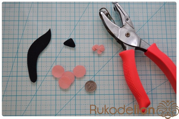 Для того, чтобы сделать скунсу глазки, дыроколом по фетру вырубаем из черного фетра два круга диаметром 5 мм. Если у вас нет такого дырокола, то эти кружочки вы можете вырезать маникюрными ножницами.