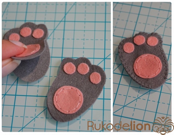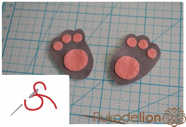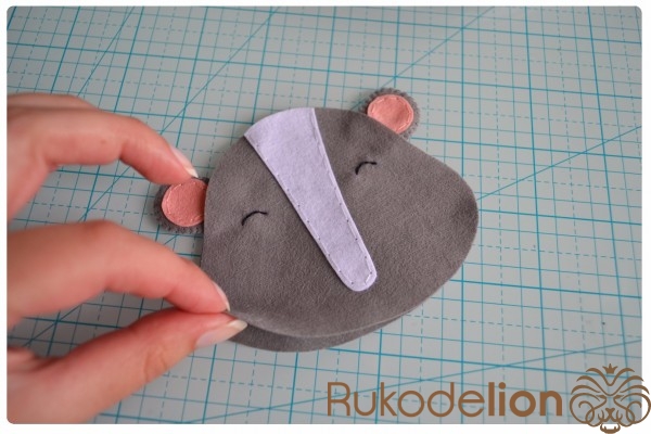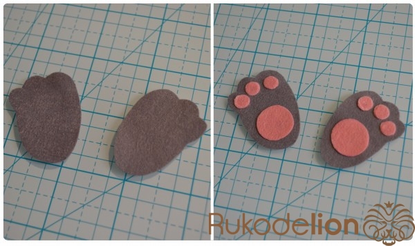 Из черного фетра по выкройке вырезаем узор хвоста. Чтобы сделать носик, из черного фетра вырезаем произвольно треугольник и закругляем его углы. Также на розовом фетре 4 раза мы обводим копейку. Вырезаем нарисованные круги. У нас получились кружочки диаметром по 1 см - будущие пяточки и ушки скунса. Дыроколом по фетру вырубаем 6 кружочков диаметром 5 мм - будущие пальчики
