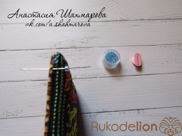 Начинаем сшивать обе детали, используя бисер (я использую мононить в два сложения). Закрепляем мононить петлёй. Продолжаем сшивать детали, чередуя бисер и "пустой" стежок.