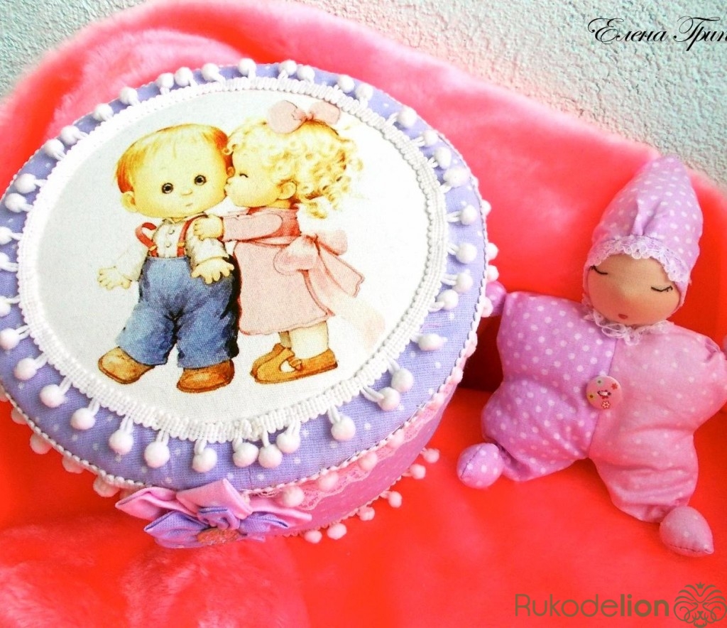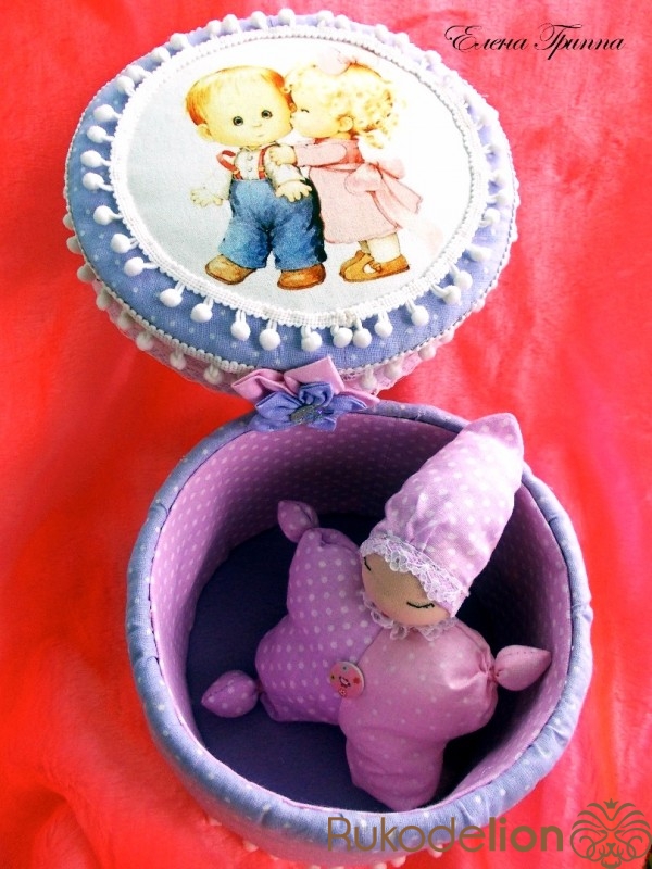 Шкатулка и вальдорфская кукла-бабочка для малышки! Такая милая шкатулка в розово-сиреневых тонах станет маминой сокровищницей, в которой она будет хранить первую пустышку, пинетки, первый бантик, любимую игрушку и другие памятные мелочи своей дочурки))), а с куколкой-сплюшкой, очень легкой и мягкой, девочка сможет играть с раннего возраста))) Материалы: ситец, перкаль, фетр, печать на холсте, картон, тесьма, синтепух. Размеры: шкатулка высота 13 см, диаметр 19 см, кукла с колпачком 20 см.