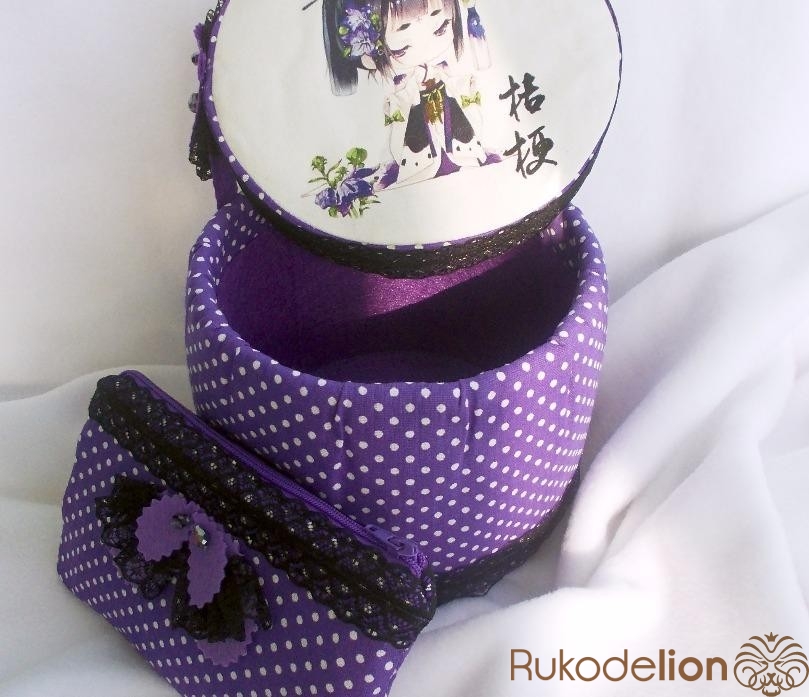Шкатулка для хранения разных девичьих мелочей и очечник (косметичка, пенал). Размеры: высота шкатулки 13 см, диаметр 17 см; очечник 17*11 см. Материалы: бязь, печать на холсте, фетр, синтепон, переплетный картон, кружево, бисер. Выполнена на заказ, показана для примера. Возможно выполнение в другом цвете, с другим принтом.