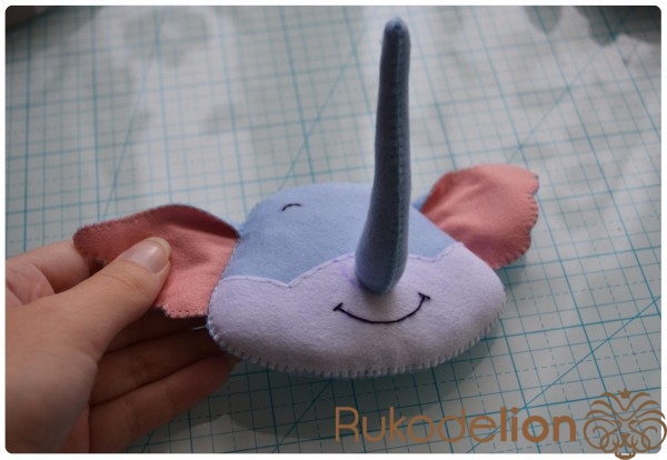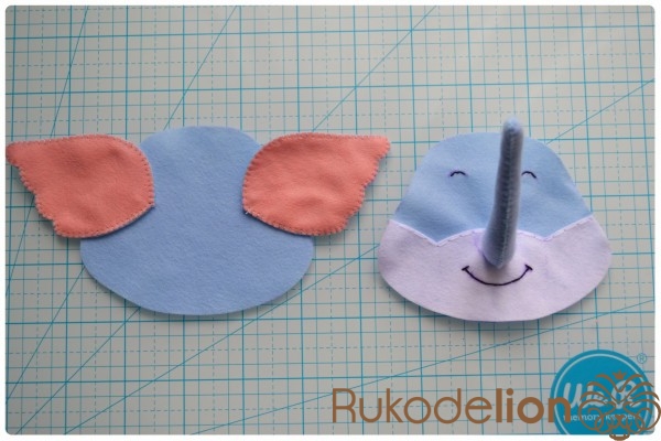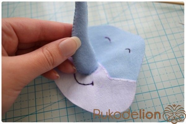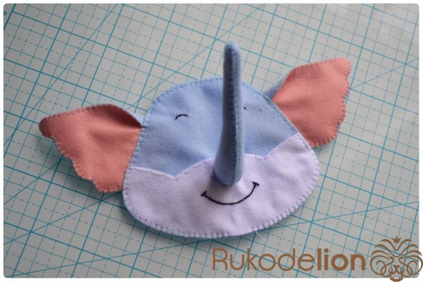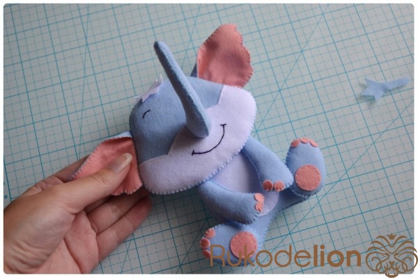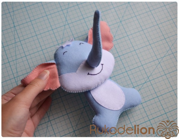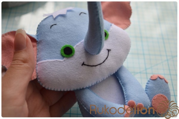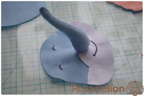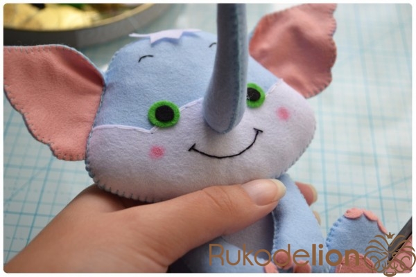 5. Отличное настроение и желание творить!Теперь прикладываем хобот к мордочке. Из него у нас еще торчит нитка с иголка. У меня она осталась сверху. Поэтому я ввожу иголку с ниткой в мордочку, затем вывожу обратно рядом с хоботом. Теперь иголкой я захватываю немного край хобота и ввожу иголку через хобот и мордочку вниз. Затем снова ведем иголку верх через мордочку и выводим рядом с хоботом. Снова захватываем чуть-чуть хобот иголкой и ведем ее вниз через хобот и мордочку. Таким образом мы идем по часовой стрелке такой спиралькой, захватывая и пришивая хобот, пока не дойдем до начала шва.