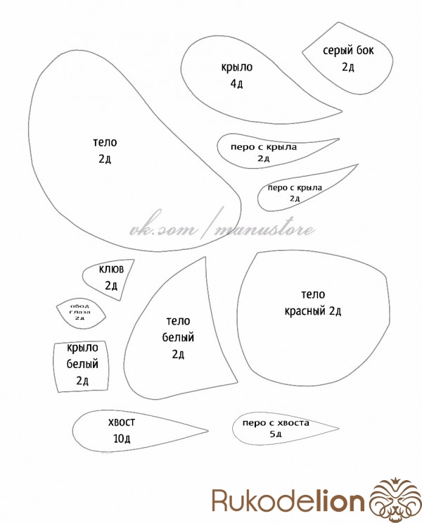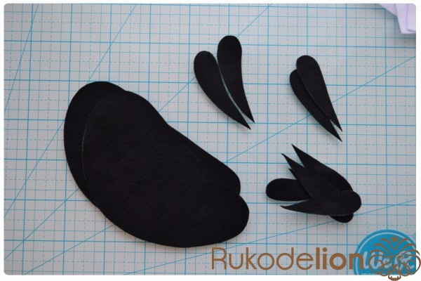 Из белого фетра вырезаем 2 детали белого участка тела, 4 детали хвоста и 2 детали узора на крыле
