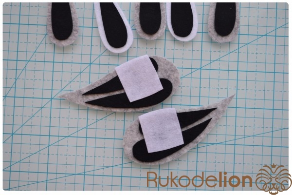 Начинаем сшивать детали. И начнем мы с самой долгой по сшиванию детали -хвоста. Раскладываем детали хвоста - 3 серых и 2 белых, а на них черные перышки. Для удобства пришивания зафиксируем черные детали капелькой текстильного клея