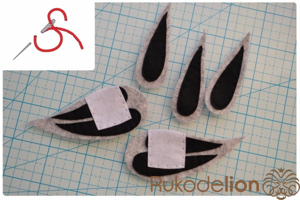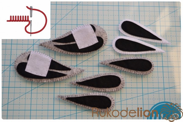 Швом "назад иголка" пришиваем перышки черными и белыми нитками