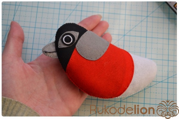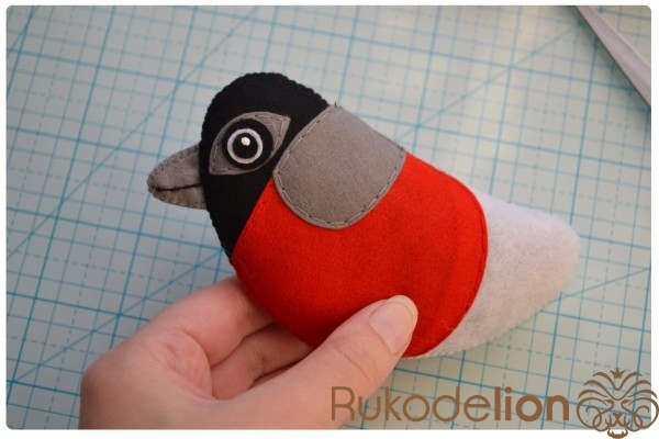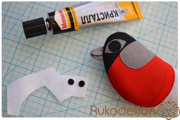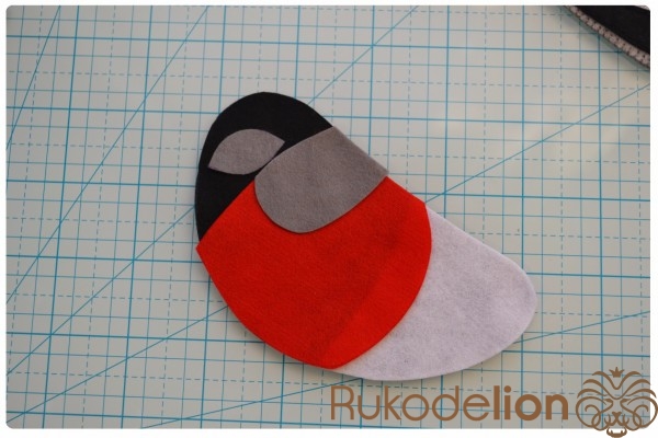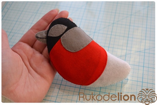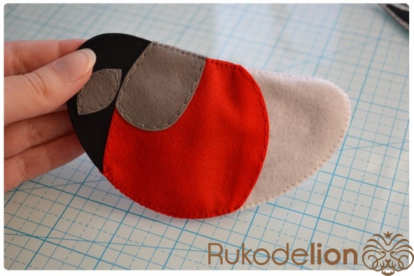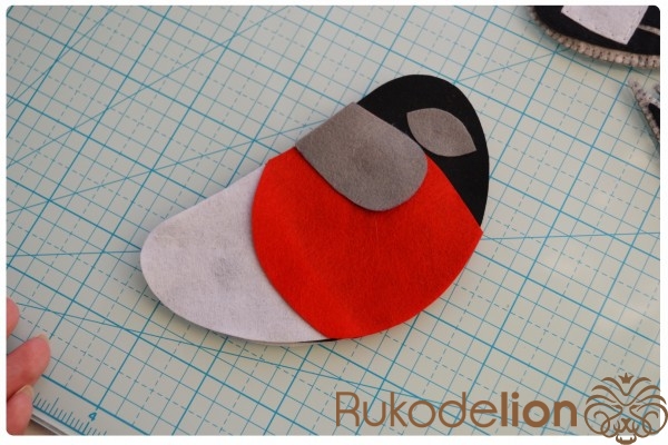 Из красного фетра вырезаем 2 детали красного участка тела, а из серого - 2 детали клюва, 2 обода глаз и 2 детали узора спинки
