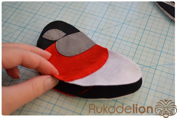 Швом "назад иголка" пришиваем красные и серые детали соответствующими нитками