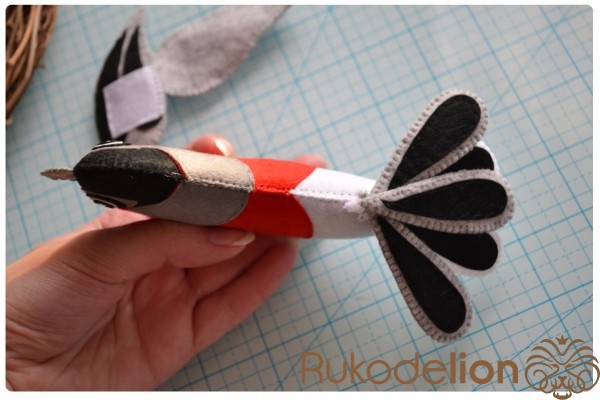 Самоисчезающим маркером или мелком обводим на фетре детали. Вырезаем. Так из черного фетра мы вырезаем 2 детали тела, 4 пера на крылья (2 типа) и 5 перьев на хвостик