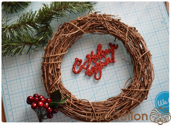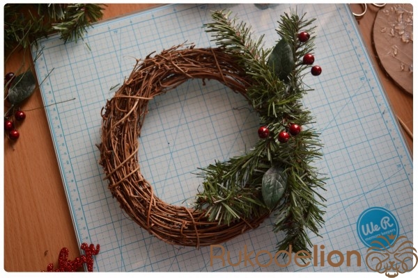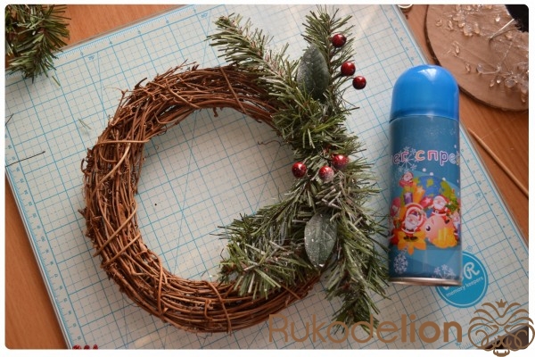 4. Для самого венка нам понадобится : основа, надпись,  искусственные веточки, ягодки, листочки и прочие украшения, которые вы найдете на новогодних базарах, снег спрей