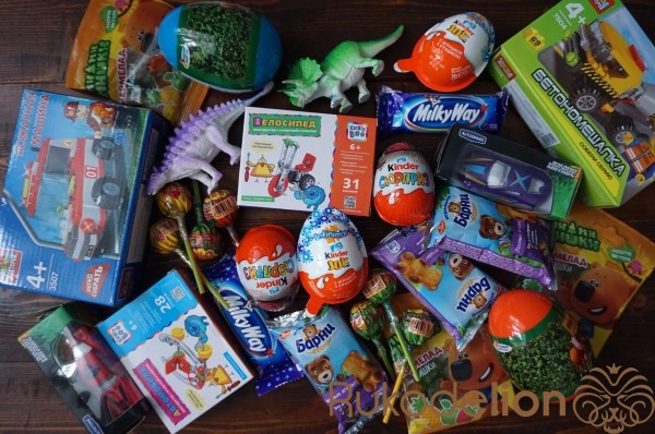 В качестве наполнения мы используем небольшие подарочки, сладости или игрушки, маленькие конструкторы. По своему опыту - лучше выбирать "скромные" подарки, чтобы у деток к наступлению Нового года подарки под елкой не воспринимались как должное и не пропало то ощущение сказки и предвкушения, которые нам как раз хочется "подогреть".