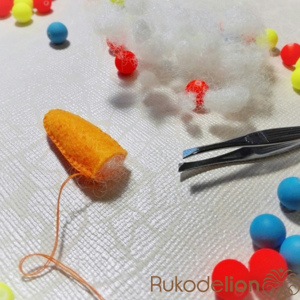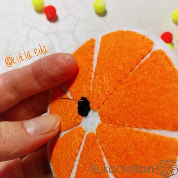 Придаем объем. Чтобы личико было плоским, как срез апельсина, использовала для придания формы круг из изолона. Тельце Апельсинчика набила синтепухом.