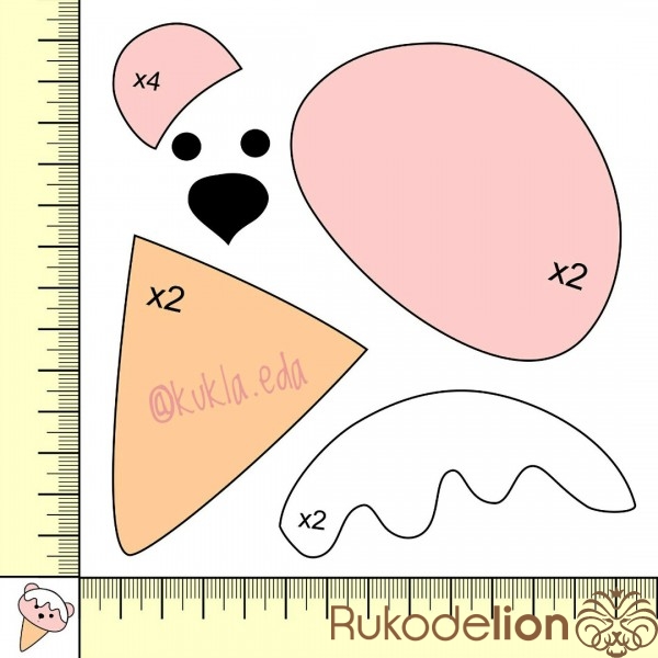 На первом этапе вырезаем детали. Обратите внимание на линейку. Из деталей соответствующего размера получится мишка 11см, с ушами - 12см.
