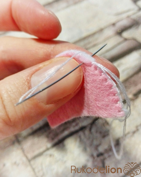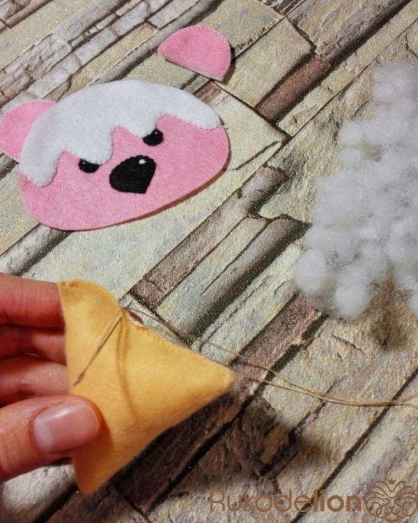 Пухлый мишка. Голову Межвежонка наполняю Синтепухом, постепенно зашивая дырочку сверху. Нитку около узелка не обрезаю, а прячу хвостик нитки в игрушку с помощью иголки.