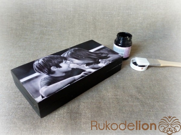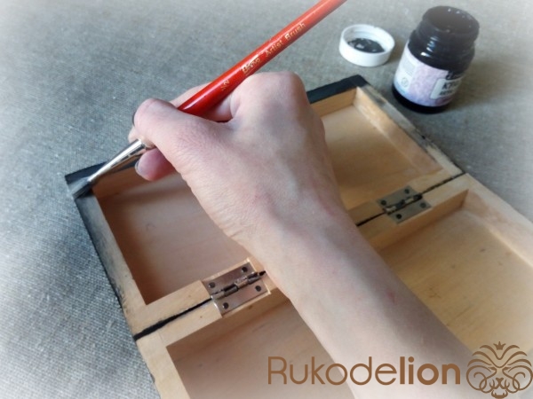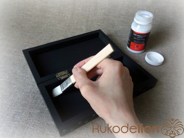 Теперь берем черную акриловую краску и, с помощью синтетической кисти, наносим ее на всю внутреннюю часть нашей заготовки, а так же на торцы лицевой ее части. Сушим и покрываем снаружи и внутри 1-2 слоями лака. Пусть вашей хорошей привычкой всегда будет - после каждого этапа вашей работы делать 1-2 слоя лака! Так вы только защитите свою работу. Но помните слой лака должен быть тонким!!! Только в этом случае ваша работа будет иметь аккуратный вид.