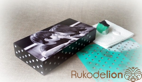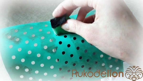 Берем трафарет в горошек, прикладываем его на торцы нашей заготовки. Далее берем акриловую краску белого цвета и наносим ее , используя губку. Брать краску нужно совсем немного, лучше отбить лишнюю краску на салфетке, делая кусочек губки полусухим! Если упустить этот момент, и краски будет слишком много, она просто затечёт под трафарет и рисунок смажется. Тоже самое проделываем с остальными сторонами. После проделанного шага, мне показалось, что белый горошек не совсем гармонично смотрится в сочетании с картинкой, поэтому я решила повторно поверх уже существующего горошка, пройтись тем же методом, но уже акриловой краской серого цвета. Если у вас нет чисто серого цвета, то смешайте белую и черную акриловые краски и у вас поучится серый оттенок. Покрываем все 1 слоем лака.