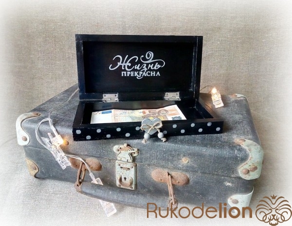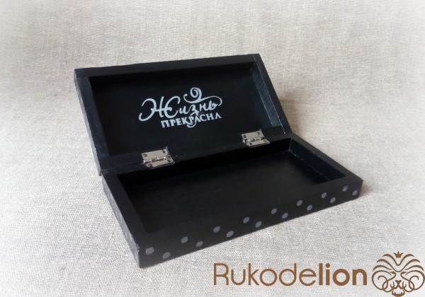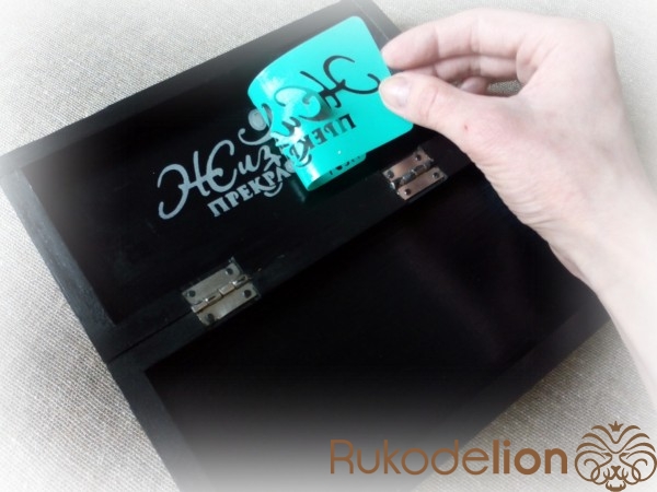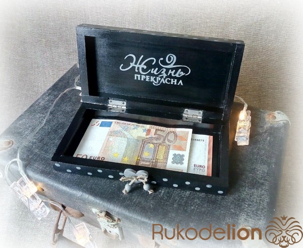 Теперь оформляем внутреннюю часть нашей купюрницы. Сначала лакируем в один слой. А затем применяем ту же трафаретную технику, что и в предыдущем шаге. Единственное, о чем хочется сказать, так это о том, чтобы вы не забыли отметить середину крышки. Это нужно для того, чтобы надпись располагалась ровно по центру. После высыхания вновь лакируем.
