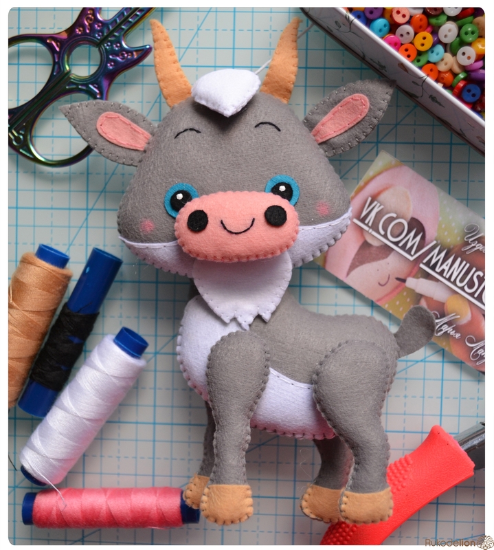 3. Инструменты и прочее: иголка, ножницы, синтепон, белая краска по ткани, румяна, пуговка, самоисчезающий маркер, клеевой пистолет со стержнем, клей "Момент Кристалл" (либо любой другой ваш любимый текстильный клей), пробойник по фетру и декоративный шнурок для подвешивания.