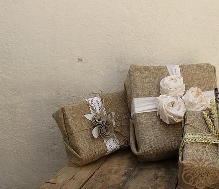 Фото 1-2-3: упаковываем различные пакеты джутовой тканью;