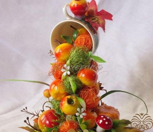 Парящая чашка. Искусственные листья и фрукты, чашка с блюдцем, сизаль.