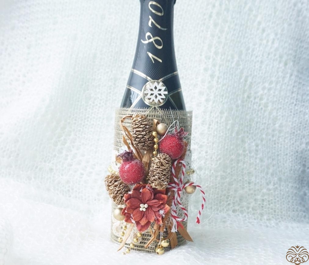 Я не стала очищать этикетки, декоративная часть у меня будет съемная, поэтому бутылочку оставила в оригинальном виде. Снежинкой я прикрыла марку шампанского, но как вариант это можно использовать в качестве декора.