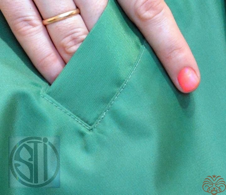 - приложить листочку с подкладкой на лицевую сторону изделия, совмещая "крестик" на листочки с "крестиком" на изделии на нижнюю линию входа в карман. Приметать или закрепить иголочками, чтобы избежать сдвига детали.